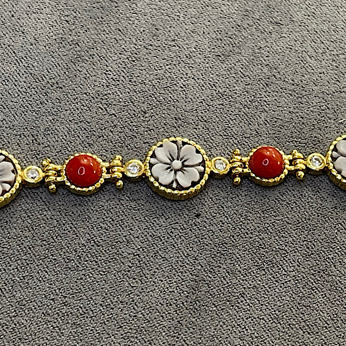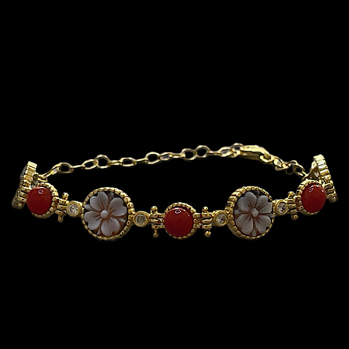 Gioielli realizzati in argento 925 con corallo sardegna autentico, cammeo italiano inciso a mano ed impreziositi da zirconi bianchi.