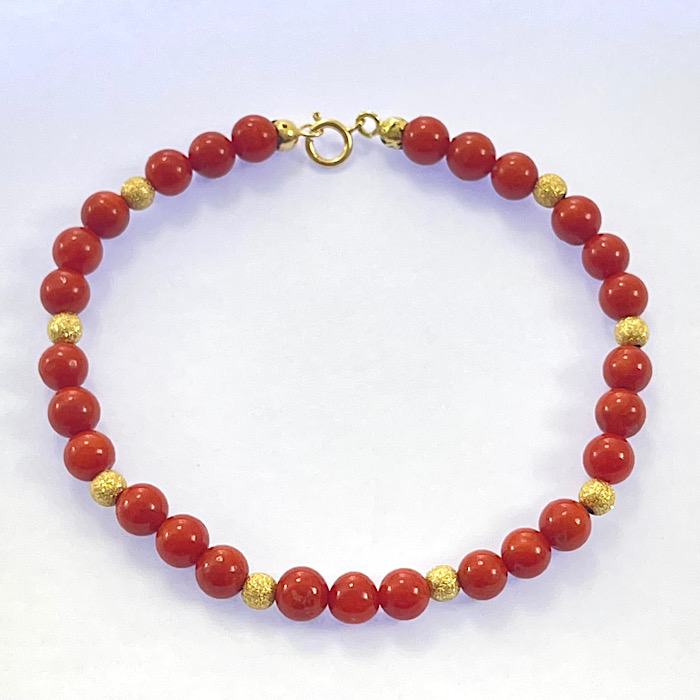 Prezioso bracciale in Corallo Rosso Sardegna autentico e certificato Corallium Rubrum realizzato interamente a mano con intercali sfaccettati e chiusura ad anello in Oro 18Kt.