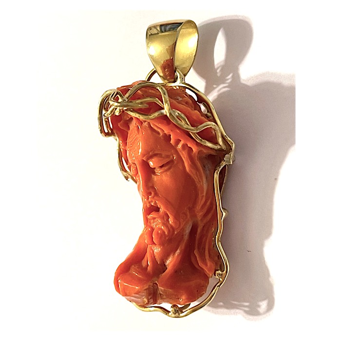 Meraviglioso ciondolo raffigurante la passione di Cristo. Il soggetto è inciso a mano su un unico pezzo di Corallo Cerasuolo (Giappone) e valorizzato da una raffinata montatura in oro 18 kt-