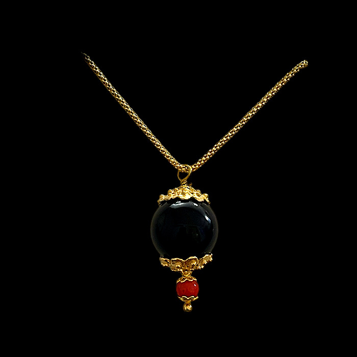 Ciondolo realizzato in Argento 925 placcato oro 18 kt rifinito a mano, composto da due semisfere in filigrana finemente lavorate che racchiudono una sfera di Onice nera liscia e una piccola sfera di Corallo Rosso Sardegna autentico.