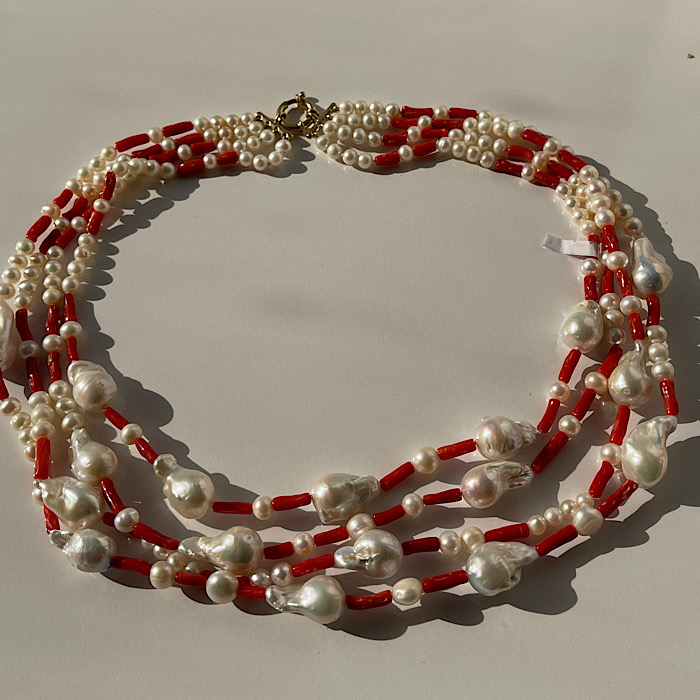 Collana 3 fili Corallo rosso Sardegna e Perle