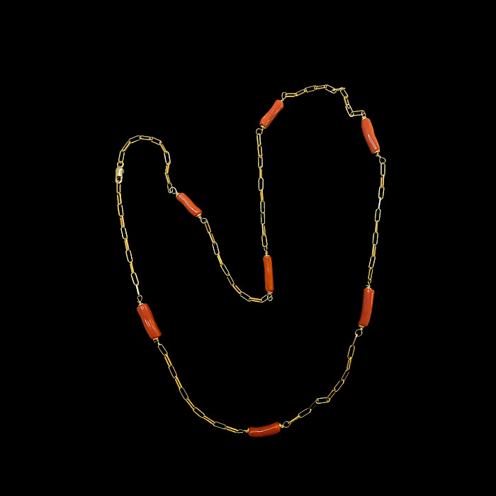 La collana è composta da una catena in Argento 925 placcata oro 18 kt intervallata da preziose cannettine di Corallo Rosso Sardegna autentico.