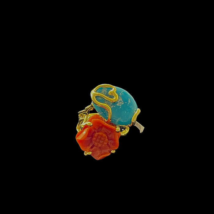 Anello dal design originale composto da un fiore inciso a mano su corallo Rosso Sardegna e da una pietra di turchese Arizona autentico, montato in Argento 925 placcato oro giallo 18 kt