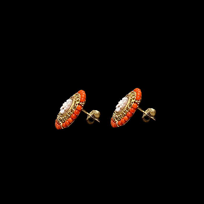 Le eccellenze del Made in Italy in un solo gioiello, realizzato in Argento 925 placcato Oro, con Cammeo inciso a mano e Corallo Sardegna Autentico certificato (Corallium Rubrum).