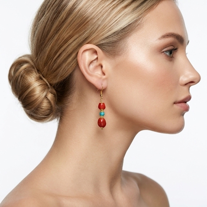 Nel complesso, questi orecchini uniscono colori intensi e materiali tradizionali, creando un accessorio elegante ma con forte carattere artigianale e mediterranee