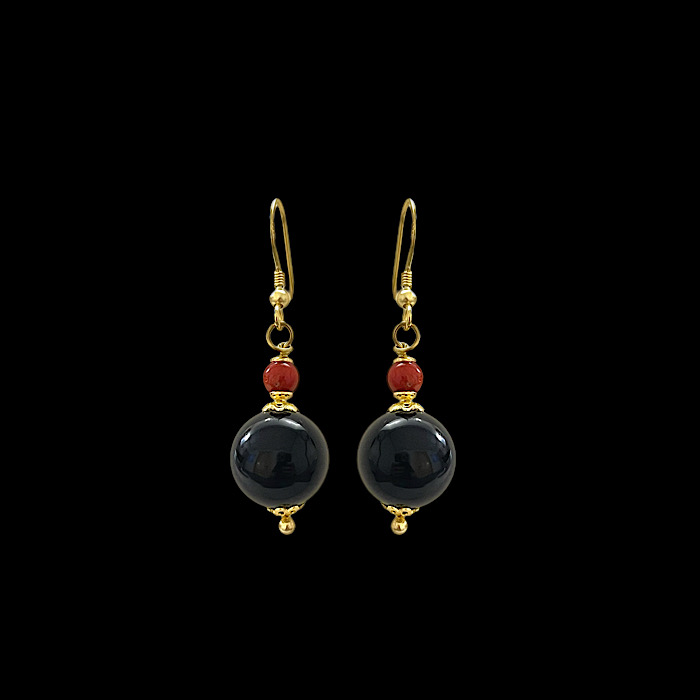 Orecchini realizzati in Argento 925 placcato oro 18 kt rifiniti a mano, composti da due semisfere in filigrana finemente lavorate che racchiudono una sfera di Onice nera liscia e una piccola sfera di Corallo Rosso Sardegna autentico.