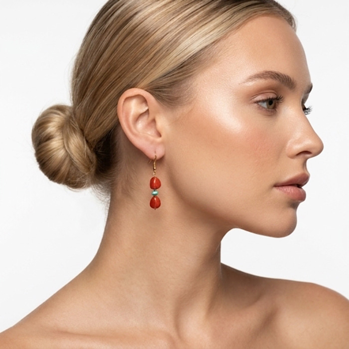 Questi orecchini sono un elegante connubio di natura e colore. Gli orecchini sono realizzati con sassi naturali di corallo rosso, dai toni caldi e profondi che richiamano la vitalità del mare, alternati ad un piccolo sasso di turchese il cui colore vivace ricorda immediatamente le Bell giornate estive.