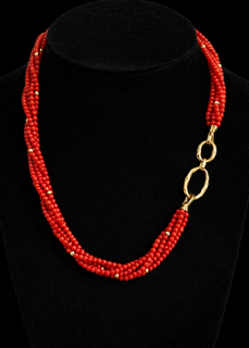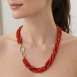 Elegante e senza tempo, questa collana è realizzata con autentico corallo rosso di Sardegna, rinomato per la sua qualità e il suo colore intenso e vibrante. Le sottili perline, finemente lavorate, creano un raffinato design multi-filo che avvolge il collo con naturale armonia.